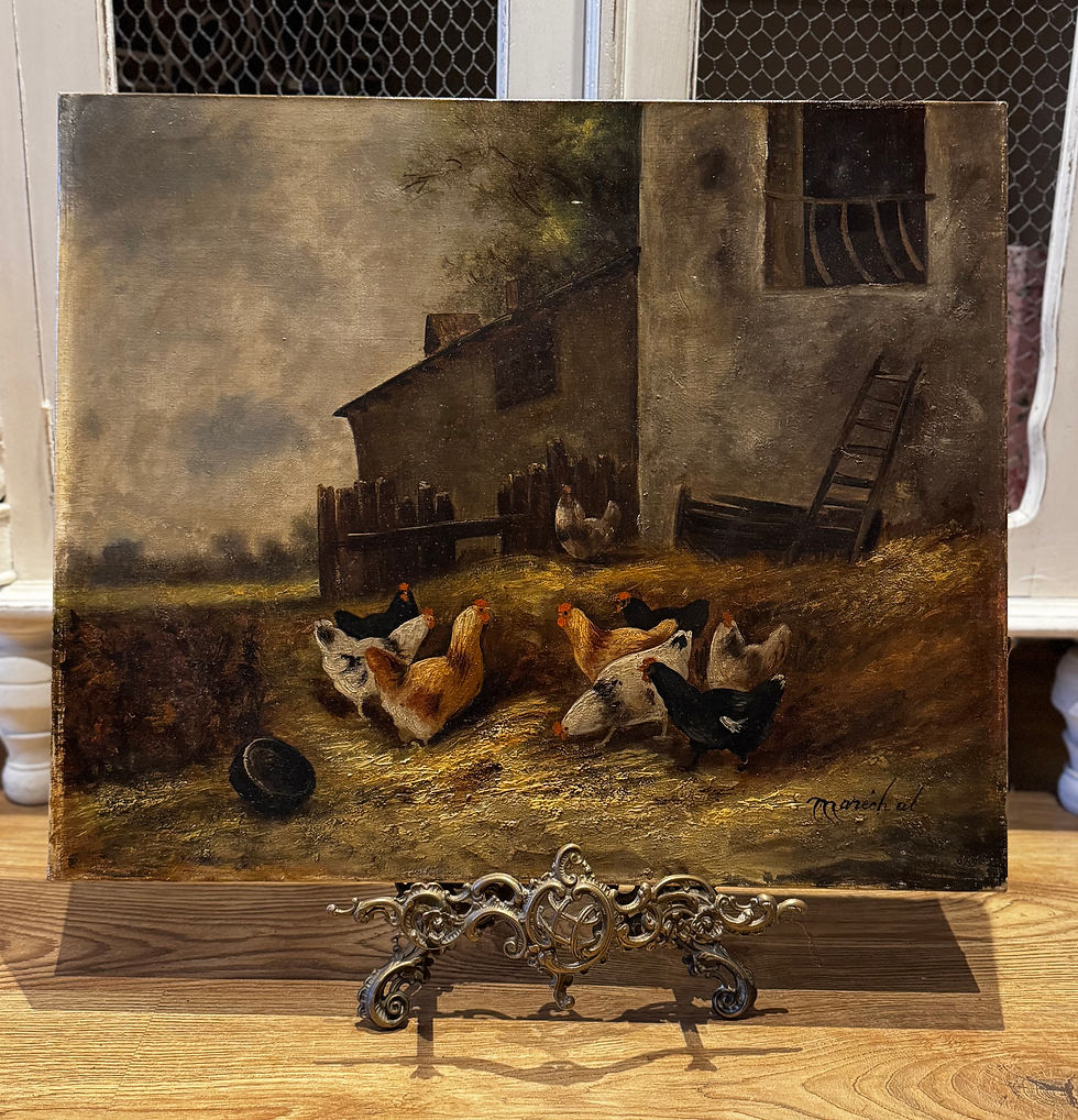 Antique 19th Century French Oil Painting ‘Chickens by Barn’ signed Marechal